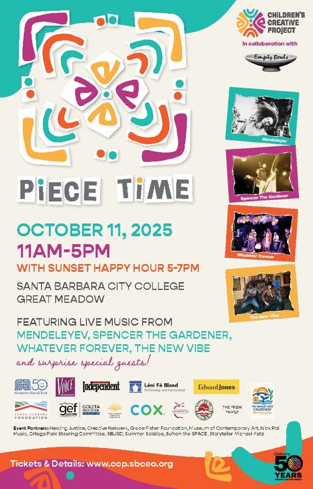 Join us on Saturday, October 11, 2025, from 11AM–5PM at the Santa Barbara City College Great Meadow for Piece Time—a family-friendly festival celebrating 50 years of arts education. Enjoy live music from Mendeleyev, Spencer the Gardener, Whatever Forever, The New Vibe, and surprise guests, plus an art market, community activities, and more. Stay for a Sunset Happy Hour from 5–7PM with food and drinks overlooking the ocean.