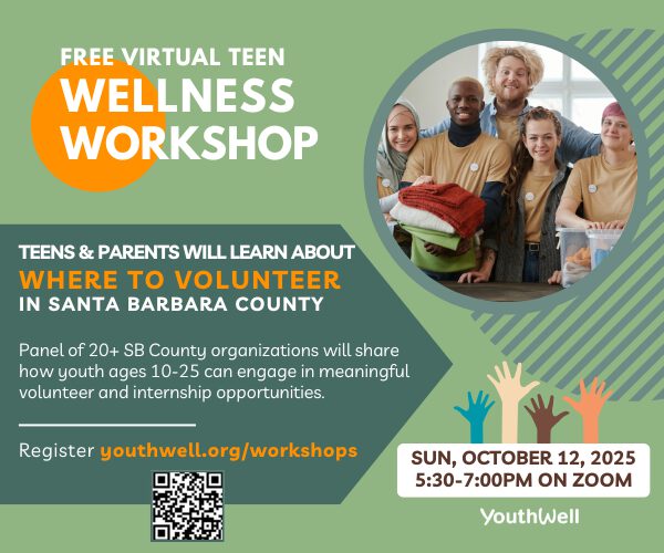 Free for youth, ages 10-21, and parents… Learn about internship & leadership opportunities in Santa Barbara County. Non-Profit Panel of 20+ SB County organizations shares about how students can create meaningful ways to volunteer. Completing community service hours is more than checking a box off the to-do list… it’s learning about the joy of volunteering, learning new skills, and an opportunity to grow and discover new passions. Find which areas (animals, arts & culture, homelessness, environment & science, education, camps, elderly) are meaningful to you. Volunteering helps people manage stress, feel connected, and increase self-confidence.