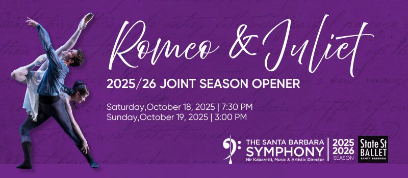 A love forbidden. A love immortal. The greatest moments from Prokofiev’s greatest ballet—the ardent Romeo and Juliet performed with grace and passion by dancers from State Street Ballet on the Granada stage. These concerts—and the season—begin as Nir Kabaretti and the Santa Barbara Symphony perform Shostakovich’s spirited Festive Overture and Rachmaninoff’s Men’s Dance from the Opera Aleko.