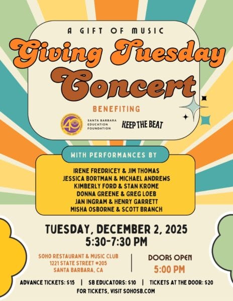 A Gift of Music: Giving Tuesday Concert will take place on Tuesday, December 2, 2025, from 5:30 to 7:30 PM, with doors opening at 5:00 PM, at SOhO Restaurant & Music Club. This all-ages event promises an evening of heartfelt performances in support of music education across Santa Barbara’s public schools.
