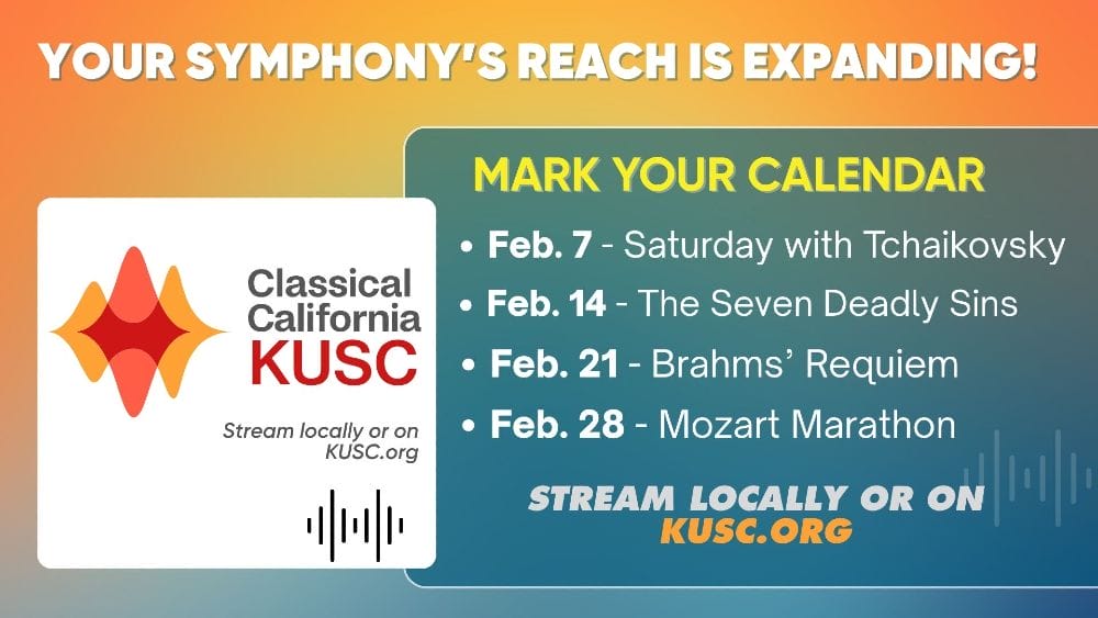 Classical California, a unified brand of Southern California’s KUSC and Northern California’s KDFC, is the nation’s largest classical music radio network, reaching millions of listeners across California and beyond, with a combined broadcast and digital audience of more than 2 million worldwide each month. Its signature program, SoCal Saturday Night, showcases performances from leading Southern California venues, including the Los Angeles Philharmonic, Pacific Symphony, and the Los Angeles Chamber Orchestra, placing the Santa Barbara Symphony among an elite group of ensembles regularly featured on the program.