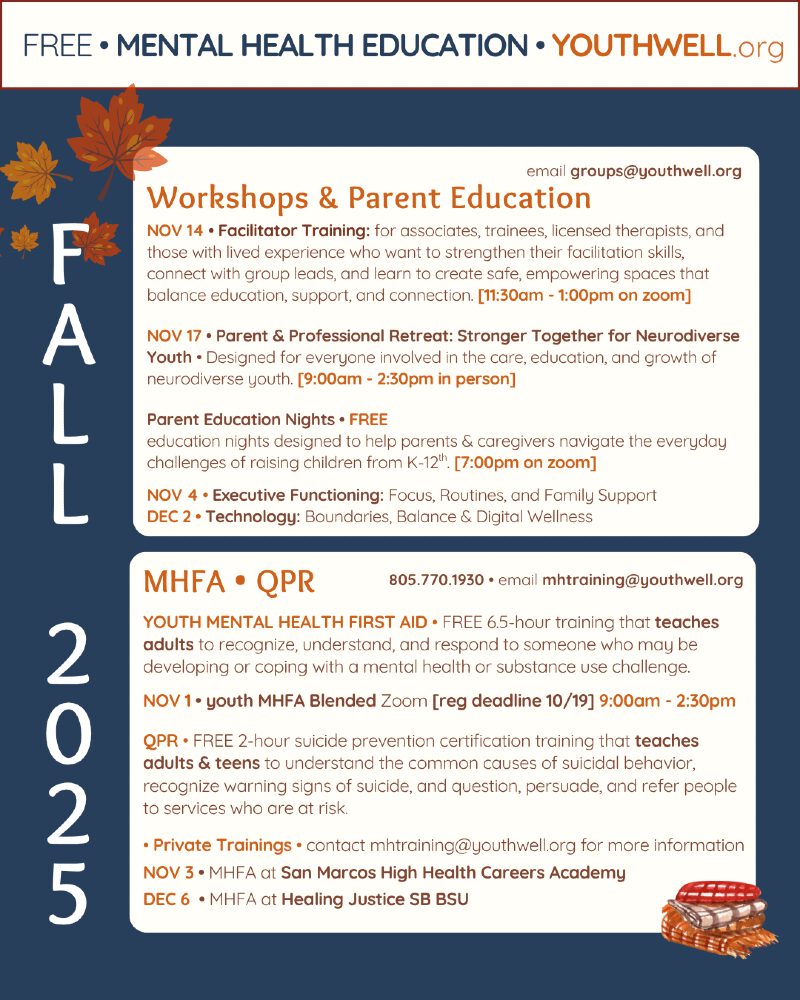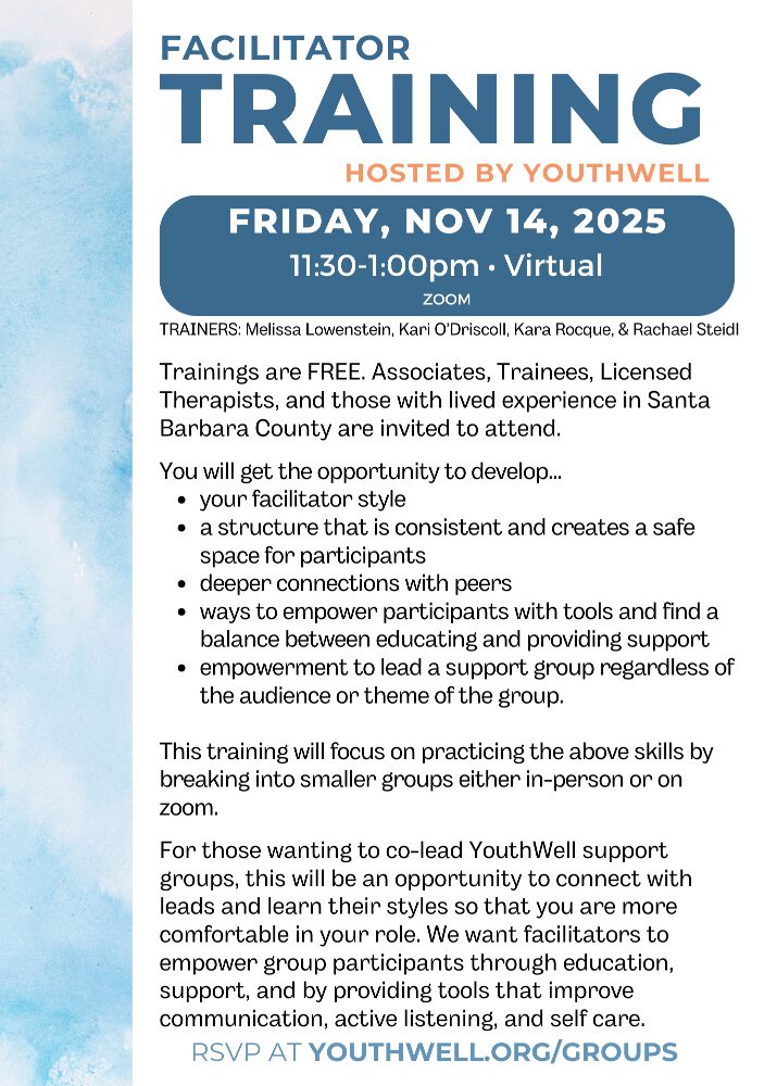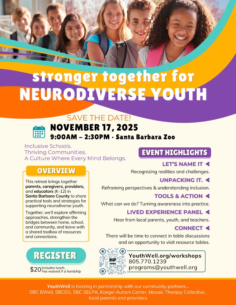 User Events 8th Annual Winter Music Showcase: Grace Fisher Foundation(October 25, 2025) YouthWell Parent & Professional Retreat(October 22, 2025) Free YouthWell Youth Mental Health First Aid Training(October 22, 2025) Free YouthWell Facilitator Training(October 22, 2025) FREE Parent Education Nights- YouthWell(October 22, 2025) Your Voice, Your Future(October 20, 2025) Iluminando la Noche bike light giveaway – Goleta(October 20, 2025) Iluminando la Noche bike light giveaway – Isla Vista(October 20, 2025) Iluminando la Noche bike light giveaway – Carpinteria(October 20, 2025) Iluminando la Noche bike light giveaway – SB Westside(October 20, 2025) Iluminando la Noche bike light giveaway – SB Downtown(October 20, 2025) Iluminando la Noche bike light giveaway – SB Eastside(October 20, 2025) Texas Guitar Quartet(October 17, 2025) 2025 California Connects: Regional Convening (Oxnard)(October 17, 2025) Downtown Safe Halloween Trick-or-Treat(October 17, 2025) Free YouthWell Parent Support Groups: TeenWell(October 16, 2025) Free YouthWell Parent Support Groups: TeenWell(October 16, 2025) Free YouthWell Parent Support Groups: TeenWell(October 16, 2025) Free YouthWell Parent Support Groups: Grupo de Padres(October 16, 2025) Free YouthWell Parent Support Groups: Grupo de Padres(October 16, 2025) Free YouthWell Parent Support Groups: Family Tools+(October 16, 2025) Free YouthWell Parent Support Groups: Family Tools+(October 16, 2025) Free YouthWell Parent Support Groups: Family Tools+(October 16, 2025) Free YouthWell Parent Support Groups(October 16, 2025) Free YouthWell Parent Support Groups(October 16, 2025)